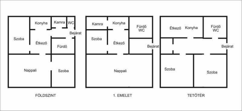 A harmadik szinten, a tetőtérben fürdőszoba, két hálószoba van egy főzőfülkével.