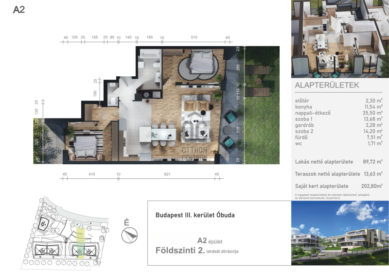 Az ingatlan nettó alapterülete 89,72 m² + 13,63 m² terasz, melyhez saját kertrész is tartozik.