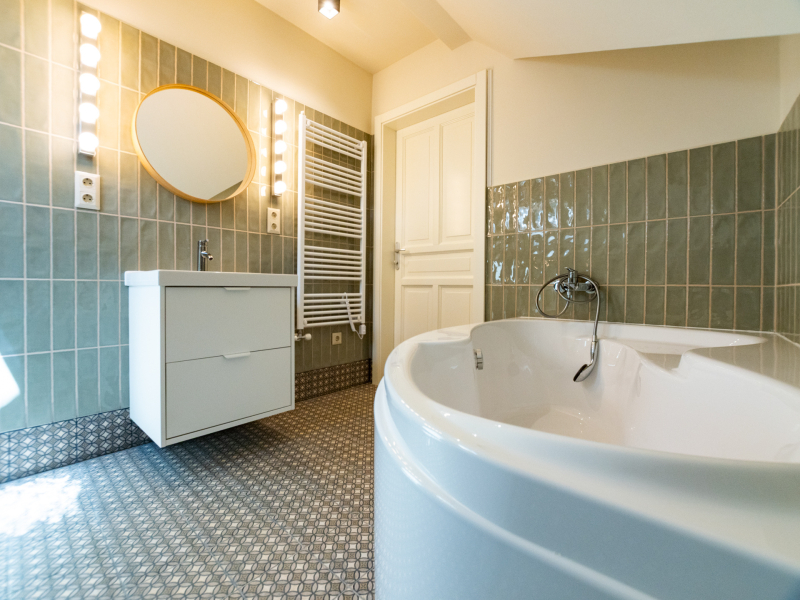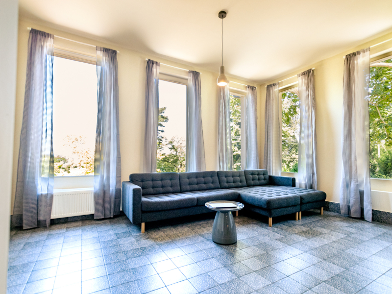 A belső terek kialakításánál a természetes anyagok és a prémium burkolatok dominálnak: a hajópadló lépésálló szigeteléssel készült, megfelelve a mai építési szabványoknak, a nappaliban és az étkezőben pedig stílusos spanyol cementlapok teszik különlegessé az enteriőrt.