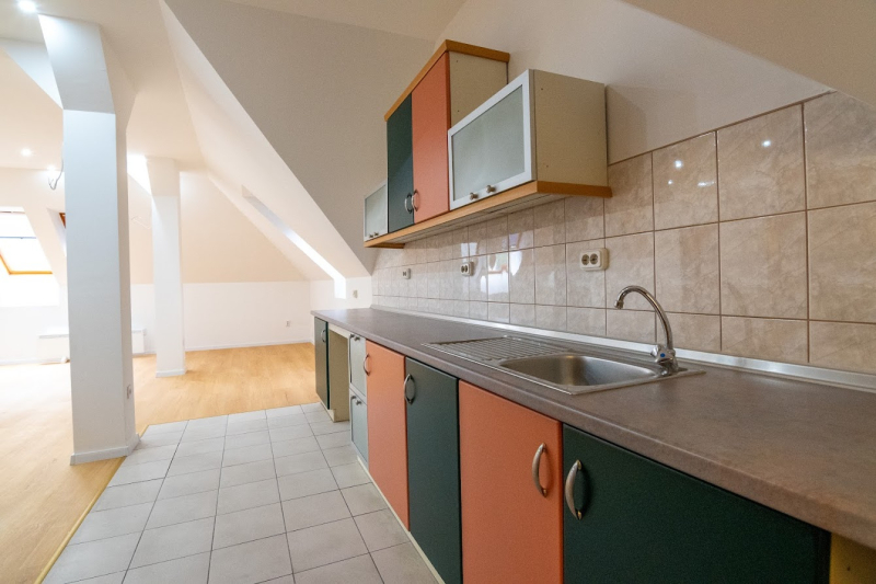 Eladó belvárosi tetőtéri lakás 2. emelet 84 m2 nappali-étkező-konyha 2 háló zárt lépcsőház riasztó, gázos, klimatizált