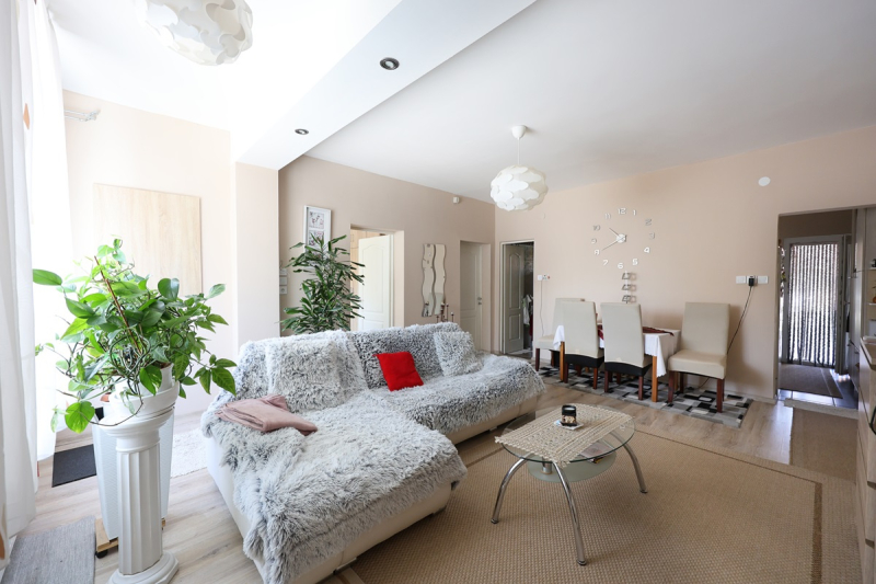 A tágas nappali világos és barátságos, tökéletes helyszín a közös pillanatokhoz.