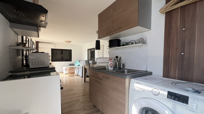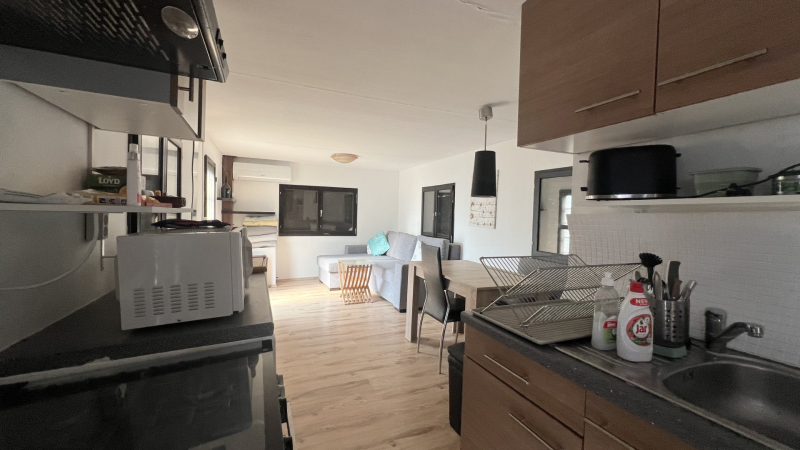 A klimatizált mobilházra a közművek közül a víz, szennyvíz, villany / új mérőórával/, rá van csatlakoztatva, gáz a telken belül található, teljesen felszerelt konyhával rendelkezik /Hűtő, tűzhely, mikró, mosógép, stb./ nappali-étkezője bútorozott.