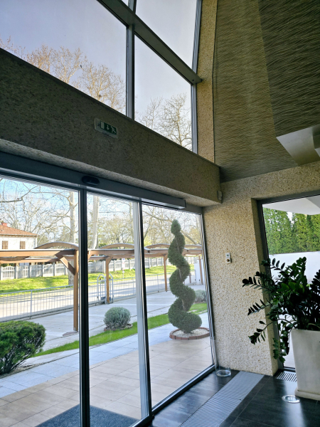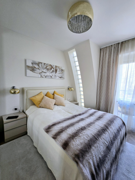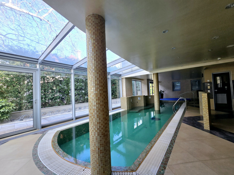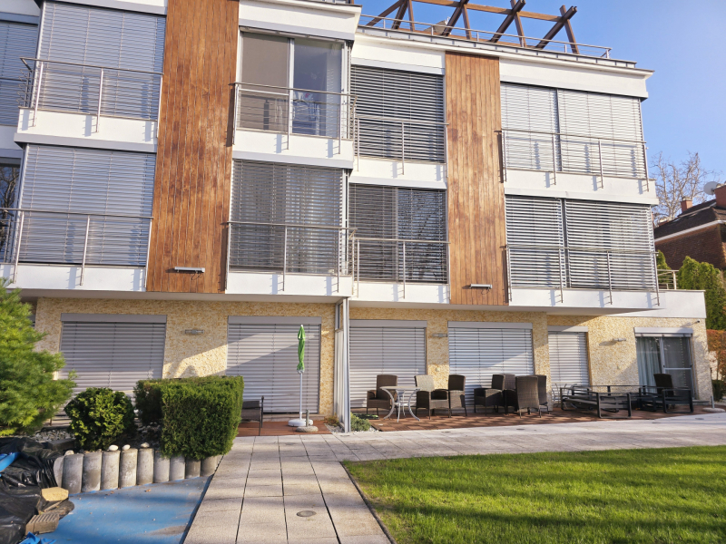 A modern, társasház gondozott kerttel, hívólifttel, wellnessrészleggel és csak tulajdonosokból álló nyugodt lakóközösséggel büszkélkedhet.