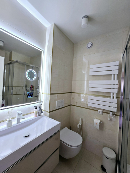 Spa-stílusú fürdőszoba prémium burkolatokkal és hangulatvilágítással, beépített LED-világítás és elegáns zuhanyzóval