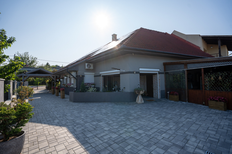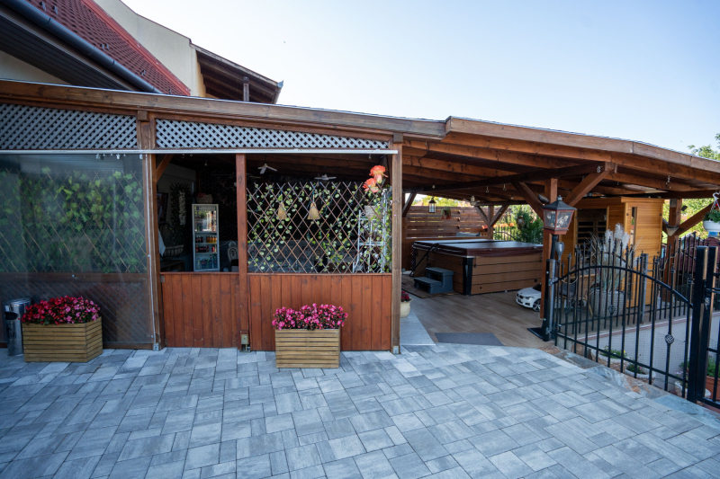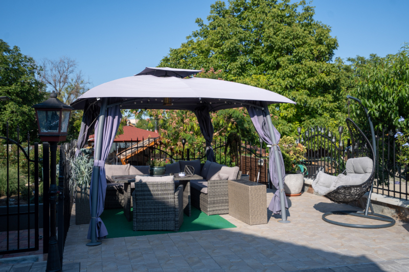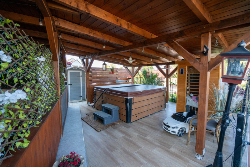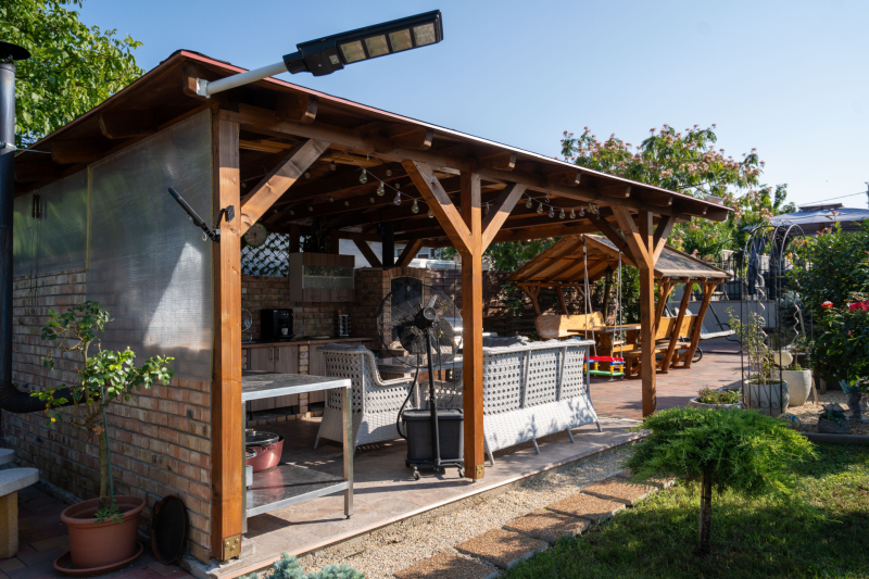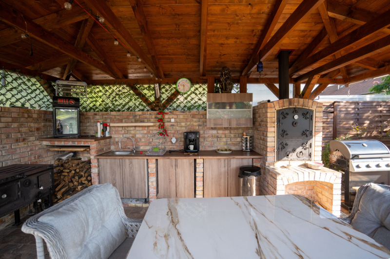 - A 850 nm telket nagyszerű koncepció mentén tagolták a tulajdonosok, így egy rendezett, szép kert öleli át az ingatlant, valamint egy hangulatos nyári konyha/sütögető filagória került kialakításra