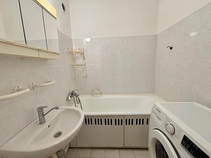A fürdőszoba és a Wc kulturált, jó állapotú burkolatokkal rendelkezik, a fürdőben egy öntöttvaskád található.