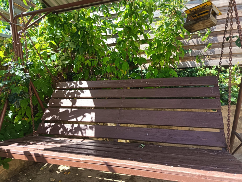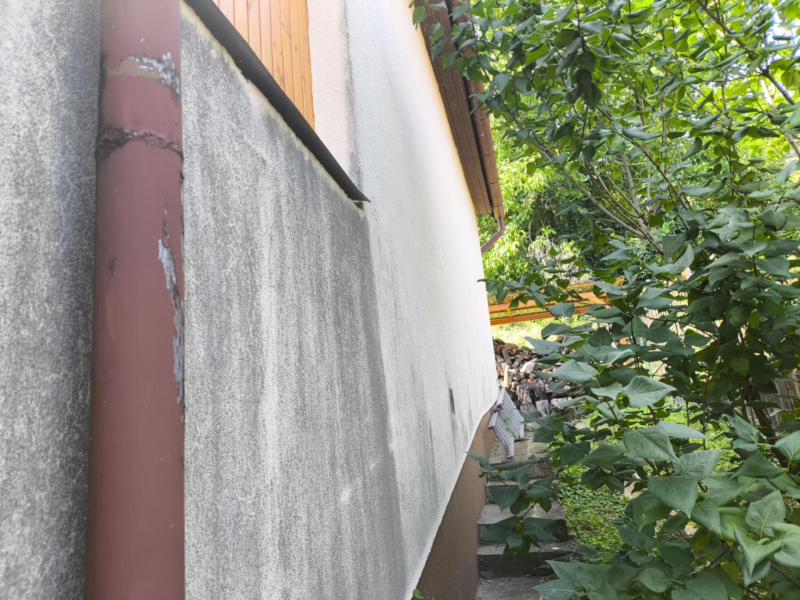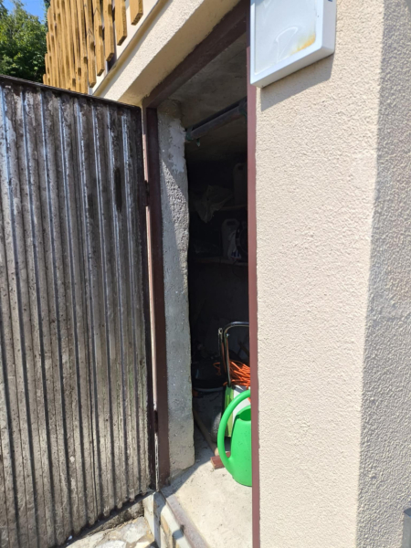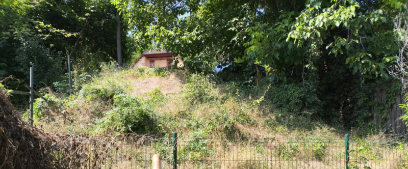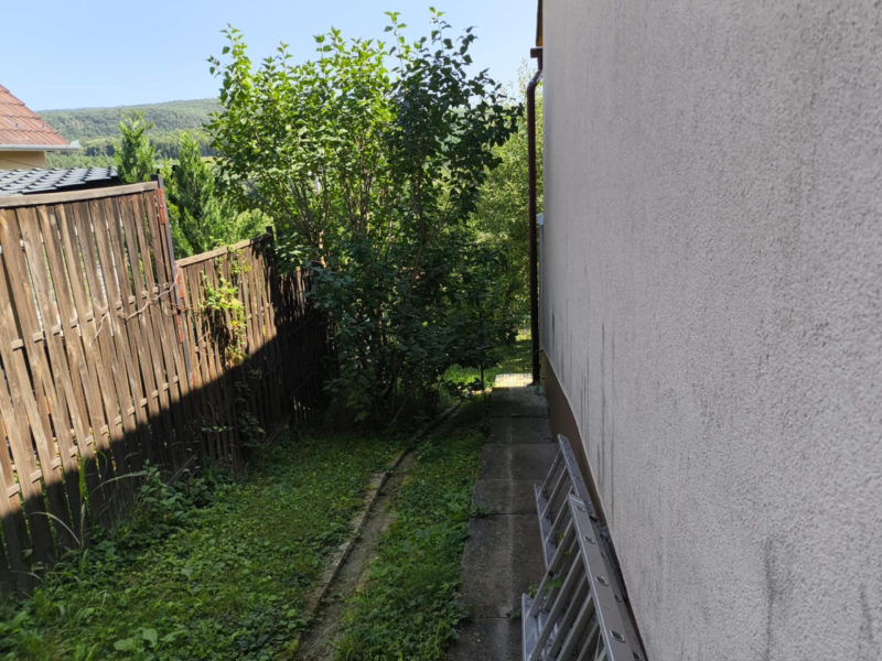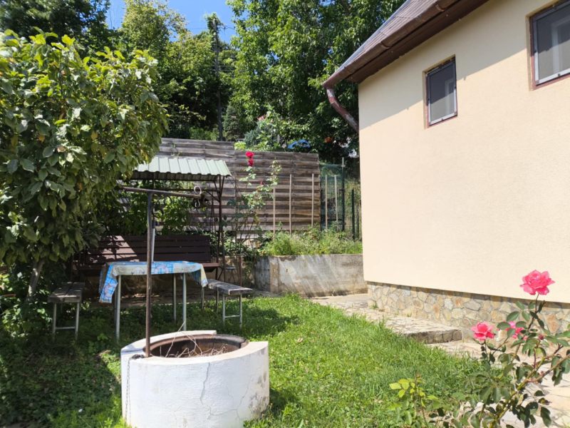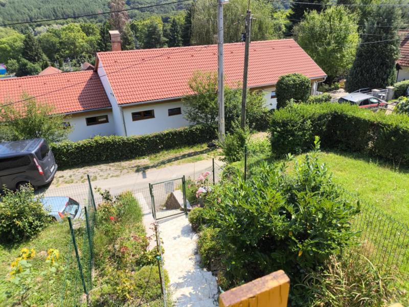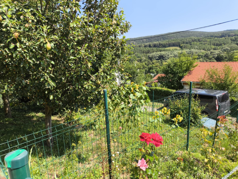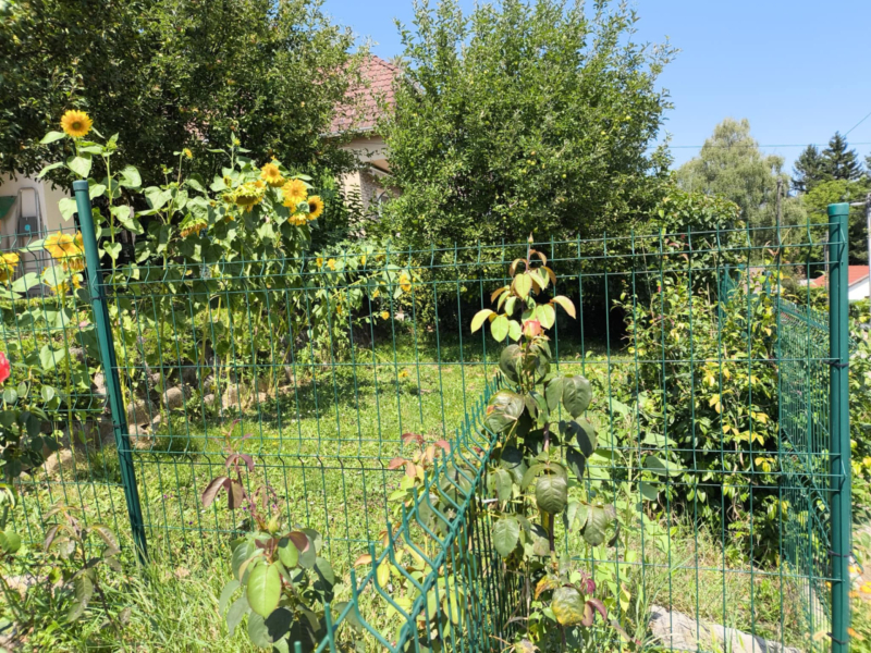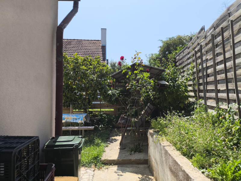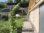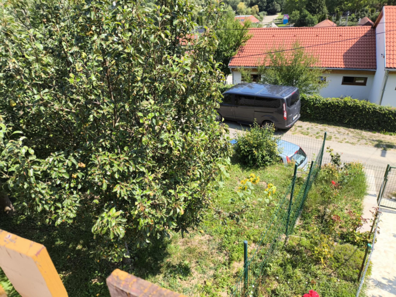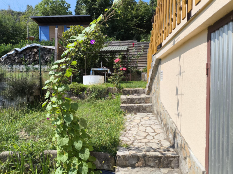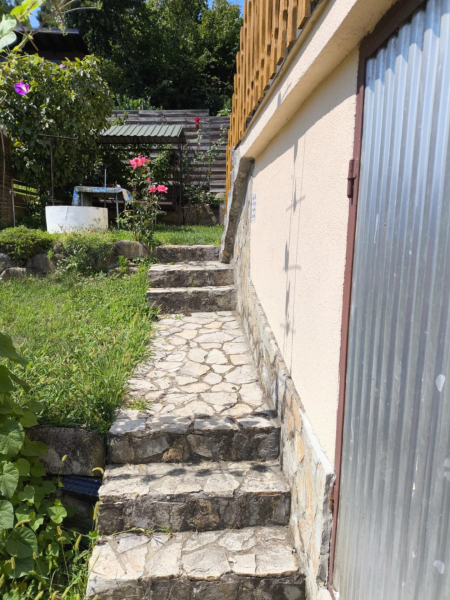 A körbekerített területre lépcsők vezetnek fel, a kis udvarban van néhány gyümölcsfa, málna, paradicsom, és füves terület a pihenéshez, napozáshoz, vagy egy kis medence is elfér. Vezetékes víz rendelkezésre áll.