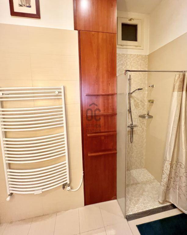 - a fürdőszobában letisztult burkolatok, oda tervezett fa beépített bútorok, prémium szaniterek, törölköző szárító, épített zuhany, mosógép, ablak