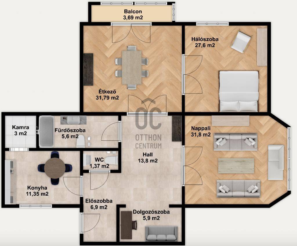 - Felosztása: előtér-közlekedő, hall, wc, kamra, konyha, nappali (hálószoba), hálószoba, étkező (nappali), fürdőszoba -wc, dolgozószoba