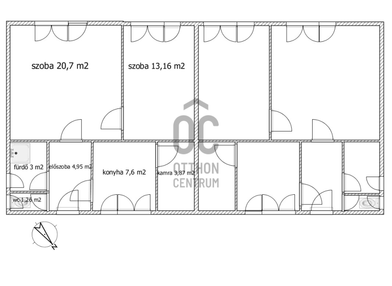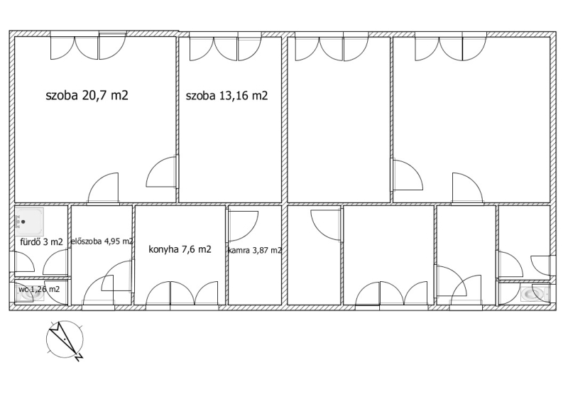 Mindkét házrészben két szoba, konyha, fürdő, wc és kamra található.
