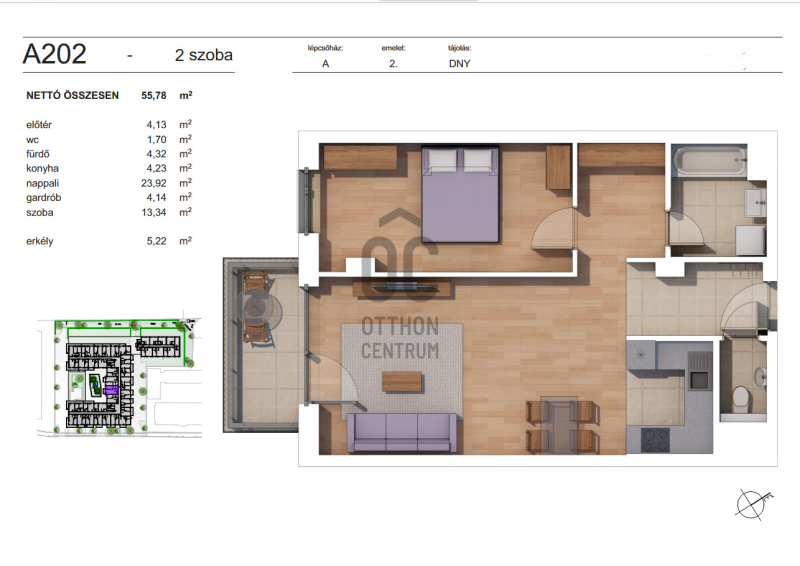 Nettó alapterület: 55,78 m2 + 5,22 m2 erkély.