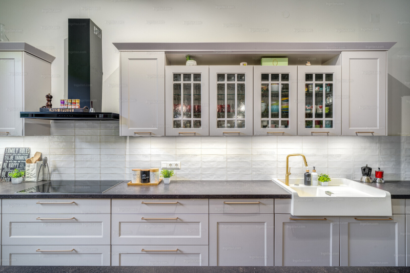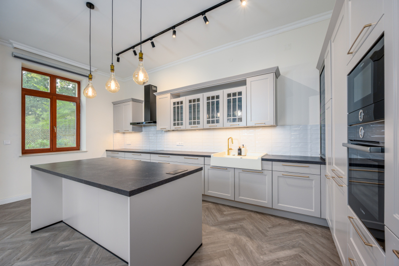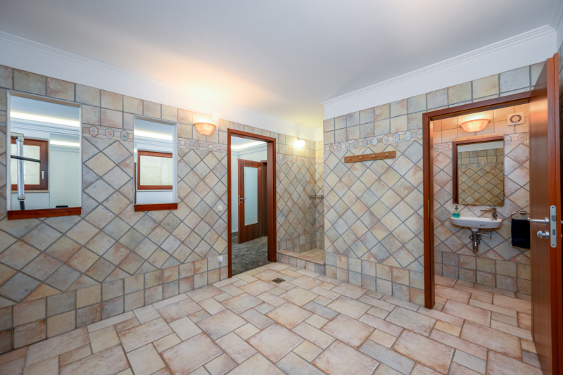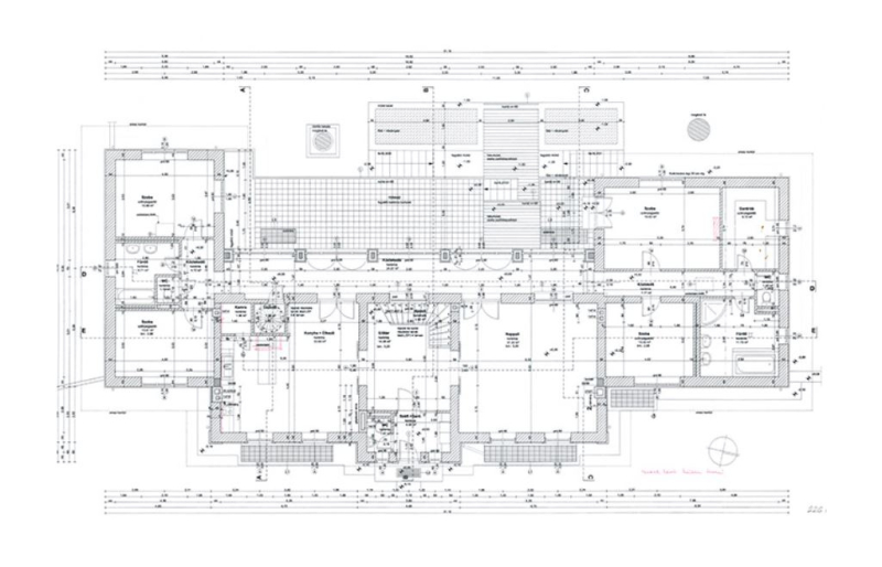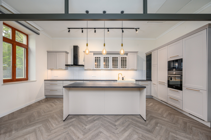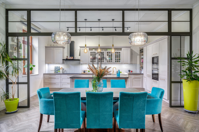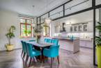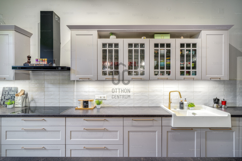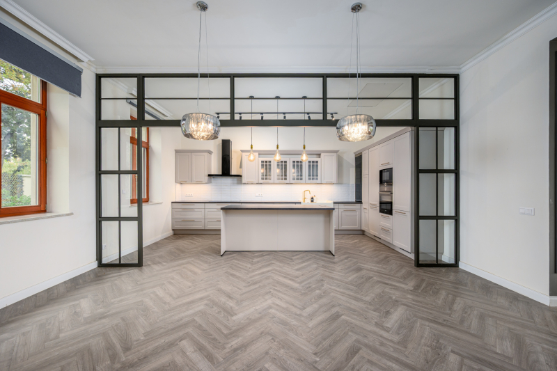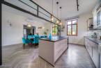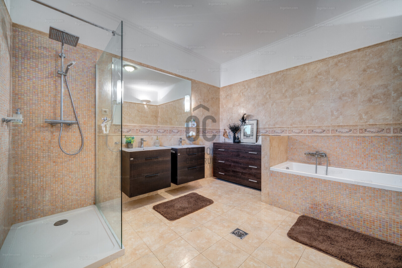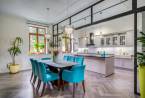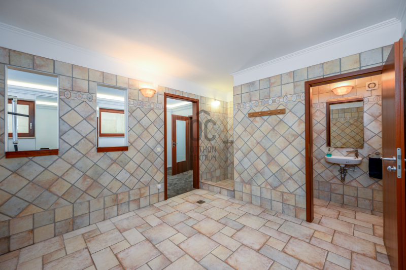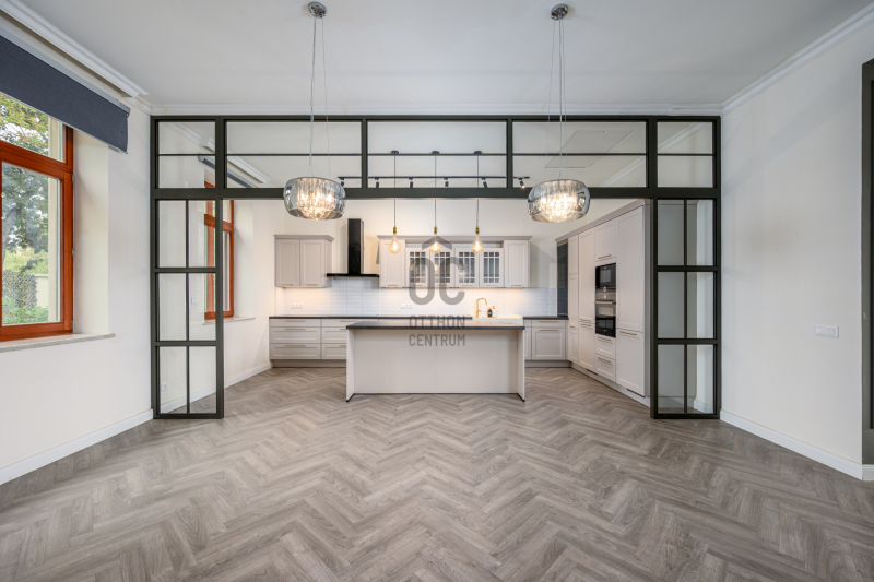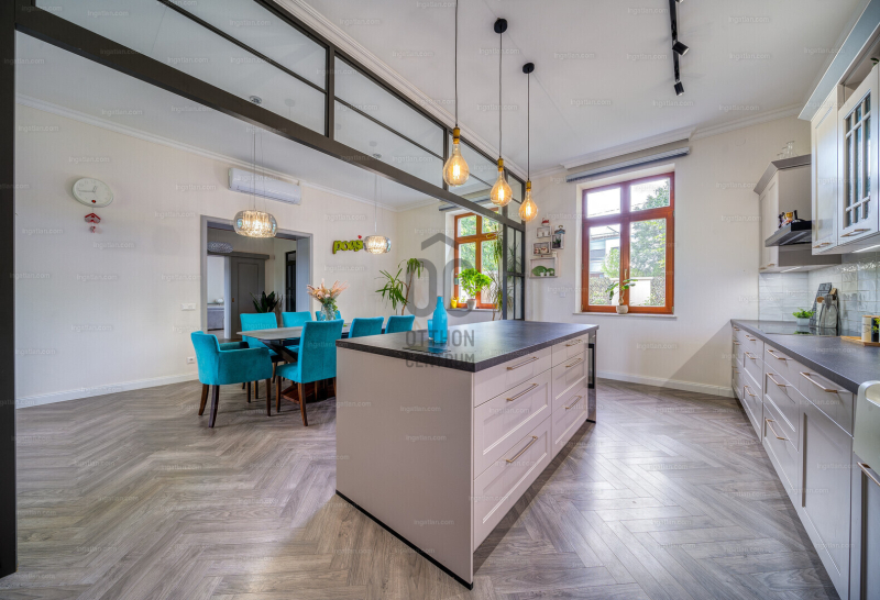 A fő lakótér 240m2, itt található az elegáns étkező és az üveg/alumínium térelválasztóval szeparált, modern, felszerelt konyha nagyteljesítményű elszívóval, kőpulttal, dupla hűtővel, borhűtővel, indukciós tűzhellyel és konyhaszigettel.