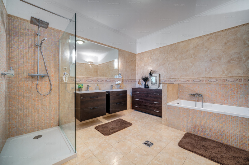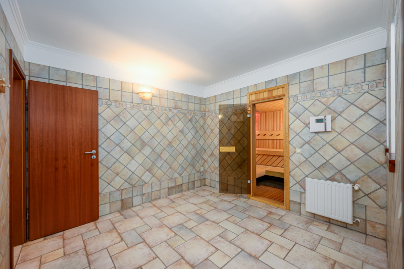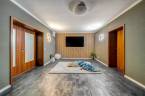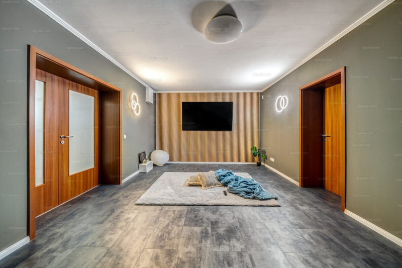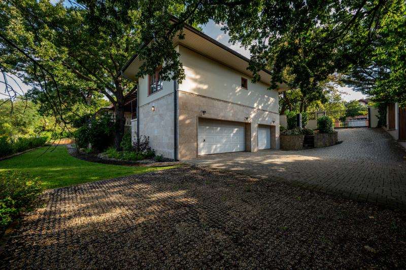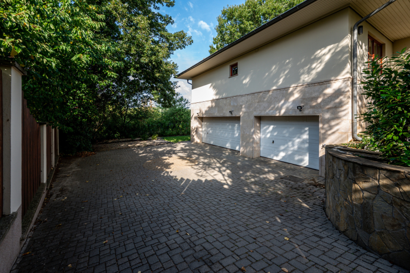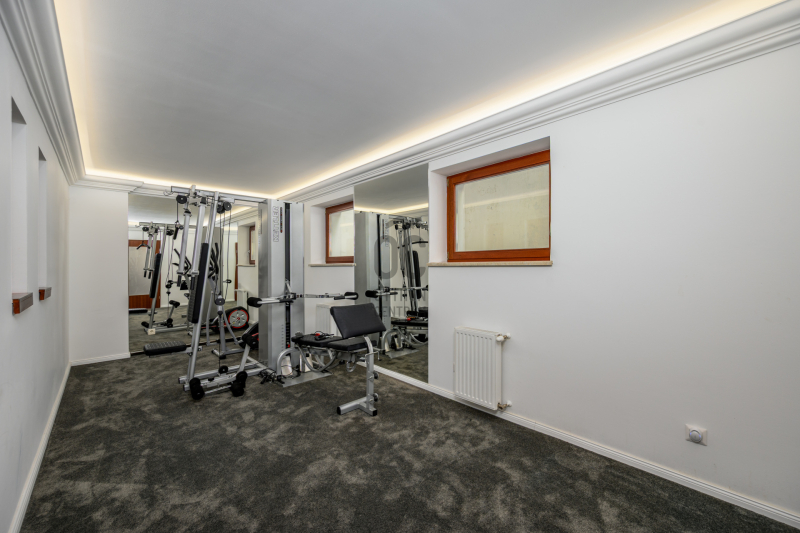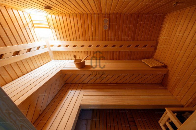Az alsó szinten egy külön bejáratú, 60 m²-es vendéglakás, edzőterem, szauna és egy moziszoba Dolby Surround előkészítéssel áll rendelkezésre, valamint egy 3 állásos teremgarázs és további udvari parkolóhelyek biztosítják a kényelmet.