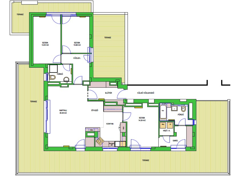 Helyiségei: Amerikai konyhás nappali ** \\\"fő\\\" hálószoba saját fürdővel, gardróbbal ** kettő másik hálószoba ** háztartási helyiség ** kettő fürdőszoba ** előszoba vendég wc-vel **