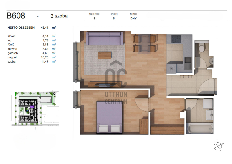 - széles körű lakáskínálat: a modern kialakítású lakások nappali+1 szobás, illetve nappali+2 szobás elrendezésben érhetők el. Néhány földszinti lakás kertkapcsolattal is rendelkezik, automata öntözőberendezéssel.
