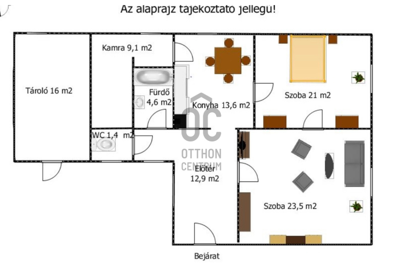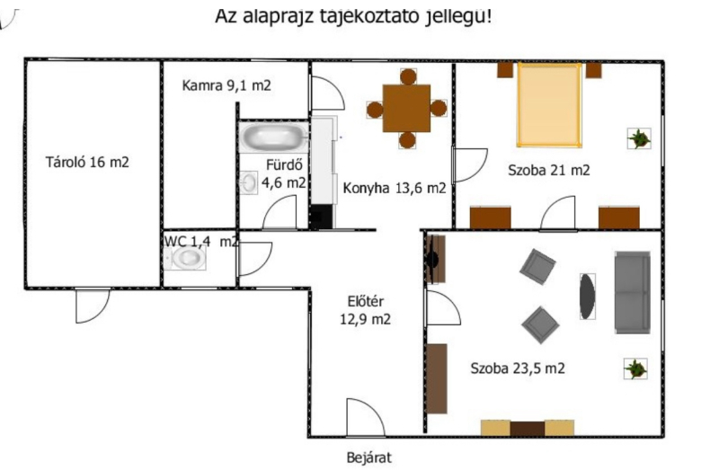 - 2 szoba, fürdő, wc, kamra, konyha, előszoba, folyosó,nagy tároló, háztartási helyiség