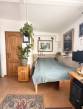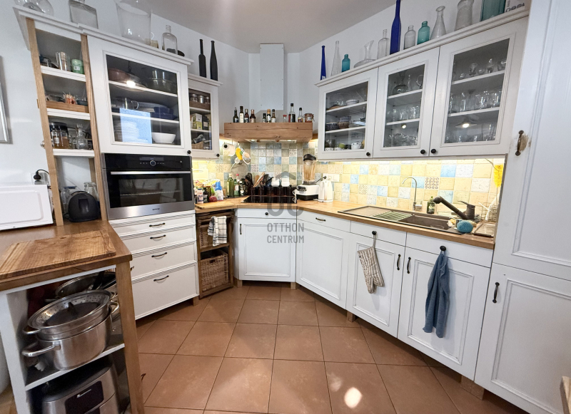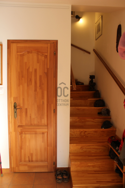 Más kétszintes új lakásokhoz képest nagy előnye az ingatlannak, hogy itt az alsó szinten nemcsak a nappali található, hanem mellette két szoba is helyett kapott, és fent is van egy szoba. A konyhabútort egy designer cég tervezte, illetve a kivitelezést is ők végezték, amely egyedi, pozdorjamentes, és fából készült.