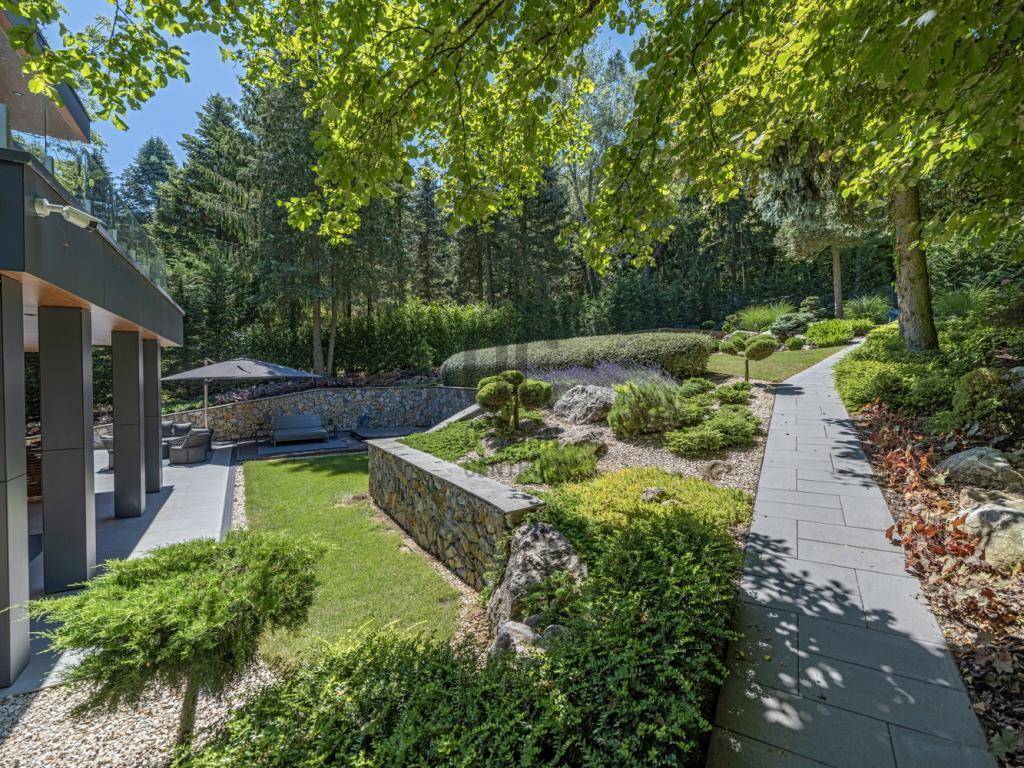 Az ingatlan forgalomtól mentes, nyugodt utcában helyezkedik el, közvetlen erdőközelben, teljesen intim, elszeparált kerttel, amely valódi privát hangulatot teremt. A gondosan ápolt kertet gazdag növényzet és virágzó zöldfelületek teszik teljessé, így a természet jelenléte mindennap érezhető.