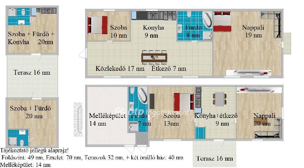 A főépület alapterületű, földszintje 49 nm, emeleti szintje 70 nm, ezen felül még a terasz és melléképület 50%-át számoltuk be a teljes nm-be. Tágas nappali, kényelmes hálószobák, modern fürdőszobák és világos konyha-étkező találhatók benne. A ház belső tereit a napfényes, barátságos hangulat és az igényesen kialakított részletek jellemzik.