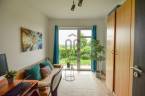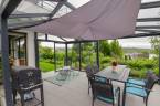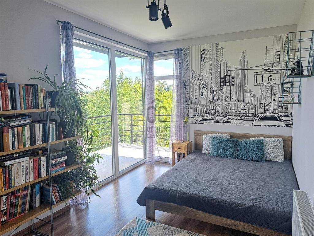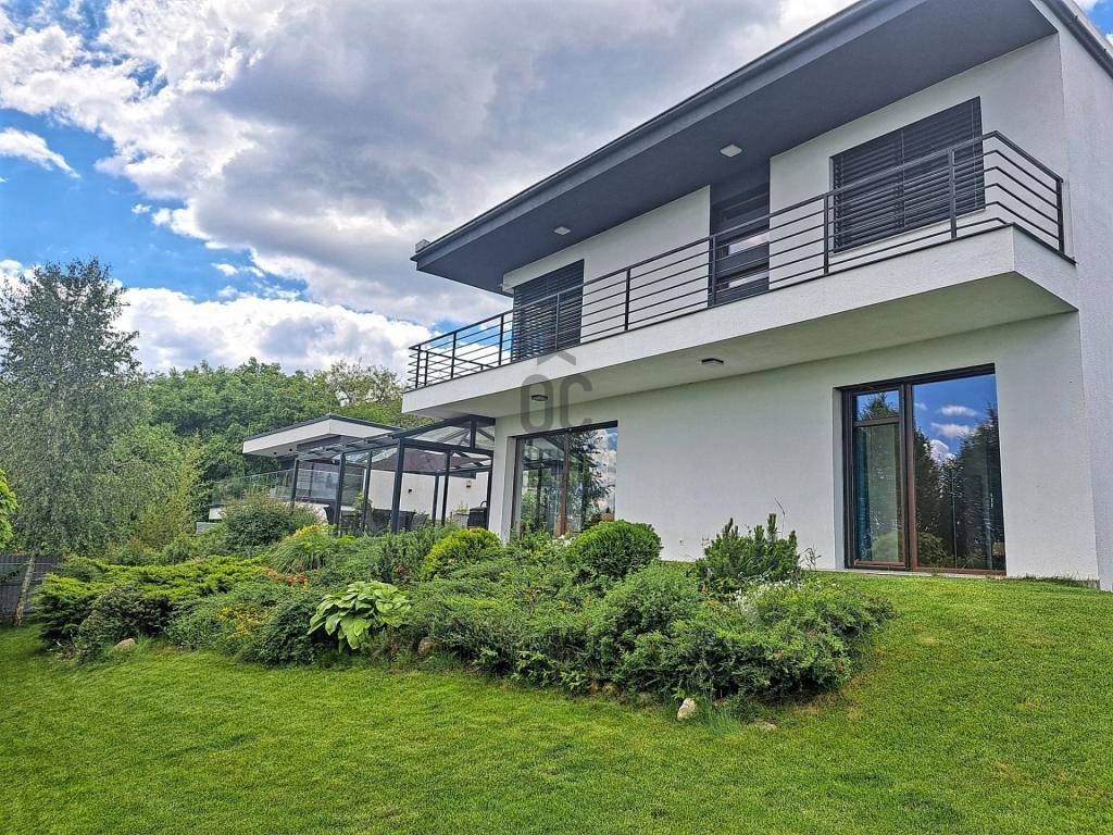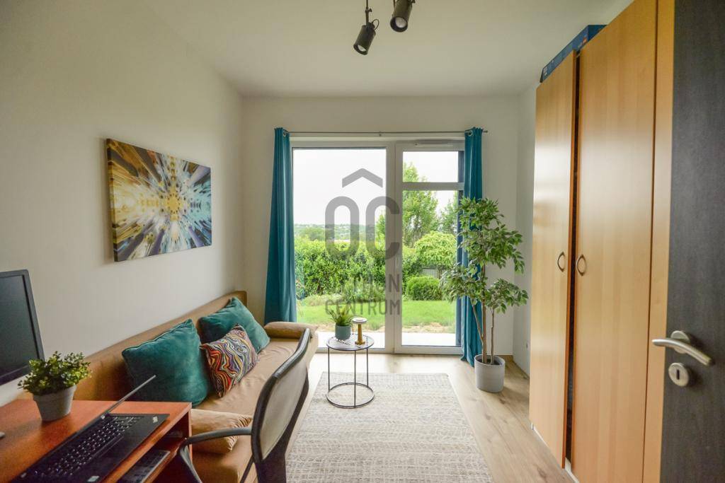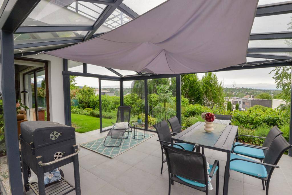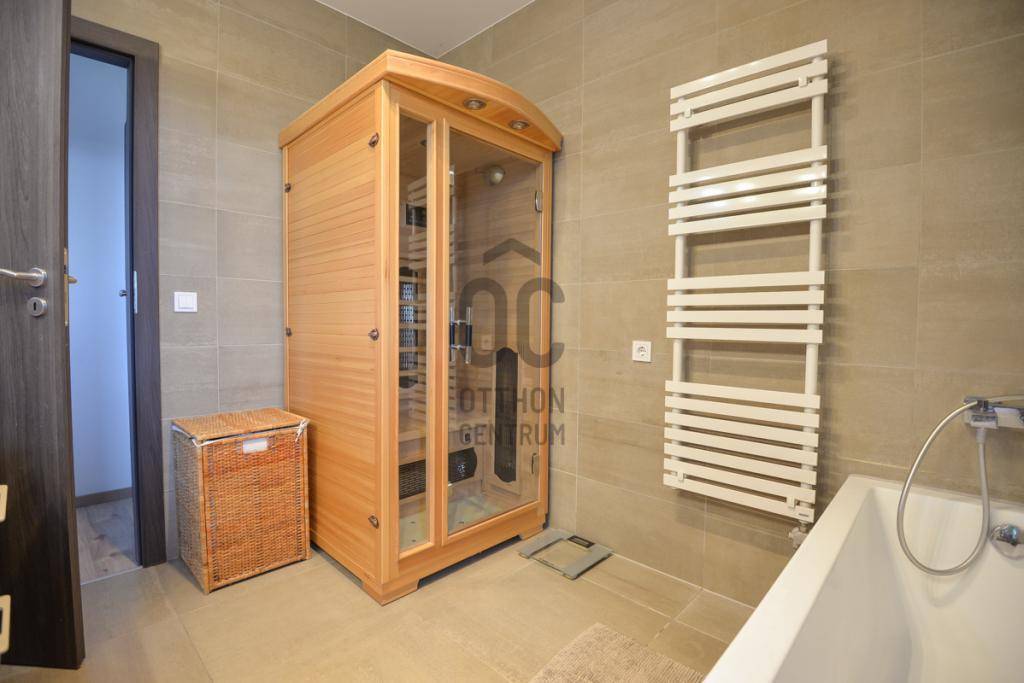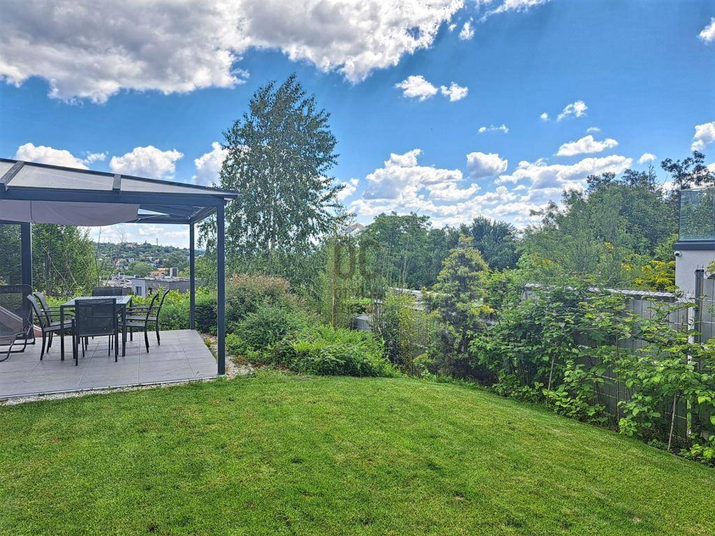 Az ingatlanhoz tartozik egy 26 m²-es panorámás erkély, egy 20 m²-es fedett, részben üvegezett terasz, valamint egy közel 400m²-es, szépen gondozott, automata öntözőrendszerrel ellátott, kizárólagos használatú kert.