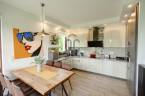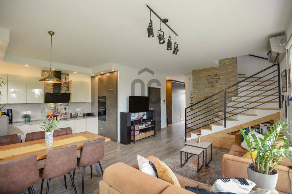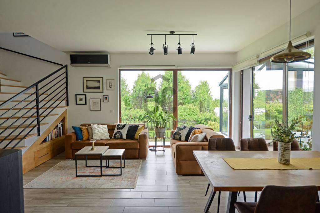 Az ikerház másik felével csak a garázsok érintkeznek, így a lakótér teljesen elszeparált, a ház nyugodt, csendes fekvésű, nem utcafronti. A földszinten tágas, világos nappali, konyha-étkező, egy szoba, fürdőszoba, külön WC, kamra, valamint a kertkapcsolatos, fedett terasz található. Az emeleten négy hálószoba kapott helyet, emellett itt is van fürdőszoba (infraszaunával), külön WC és gardróbszoba.