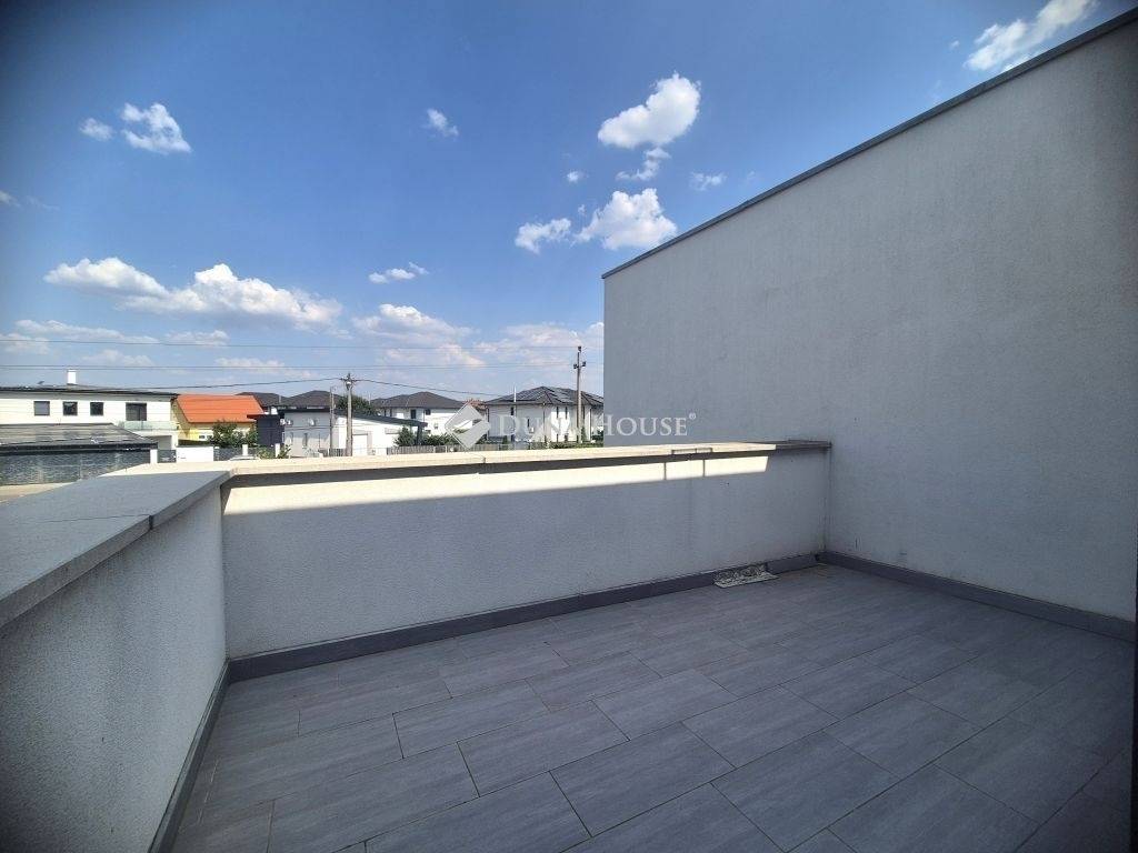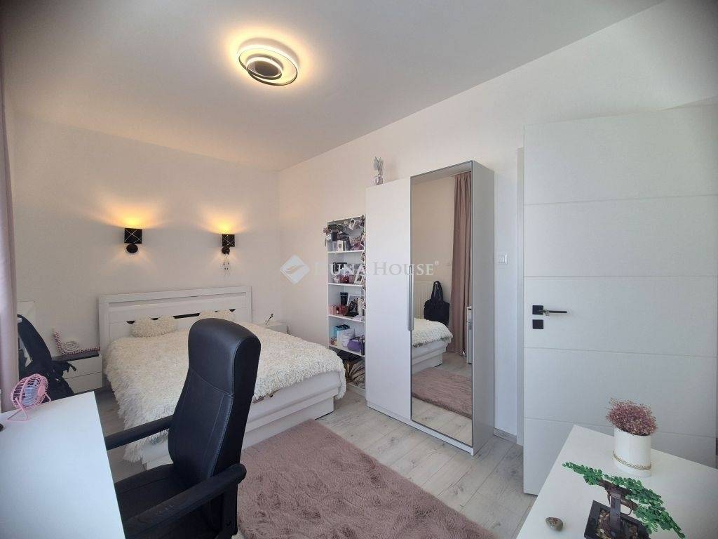 Az emeleten 3 hálószoba, fürdőszoba (épített zuhanyzóval és fürdőkáddal), gardrób szoba, és az egyik szobából nyíló 11m2 terasz található.