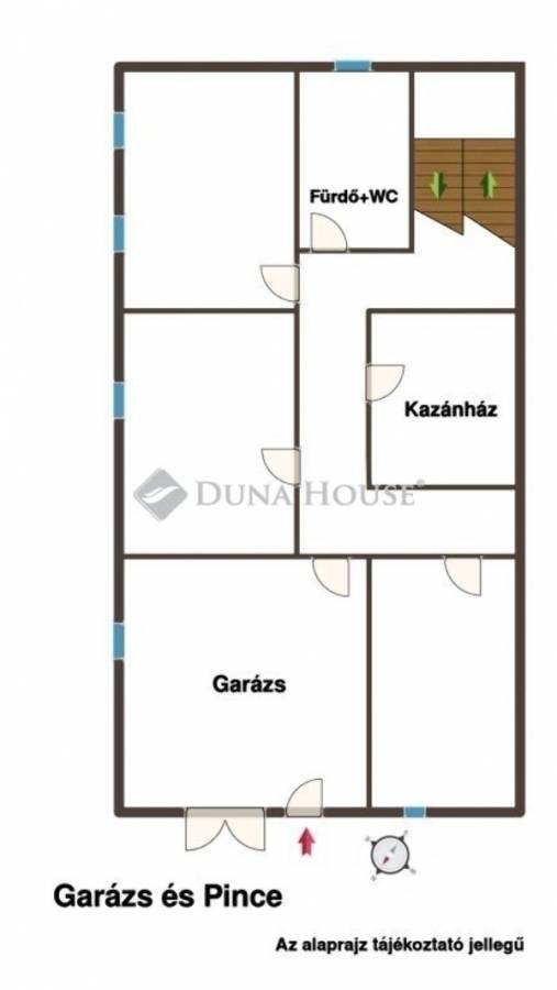 Pince: két állásos garázs, 3 tárolóhelyiség, kazánház, műhely mosó-fürdőszoba.