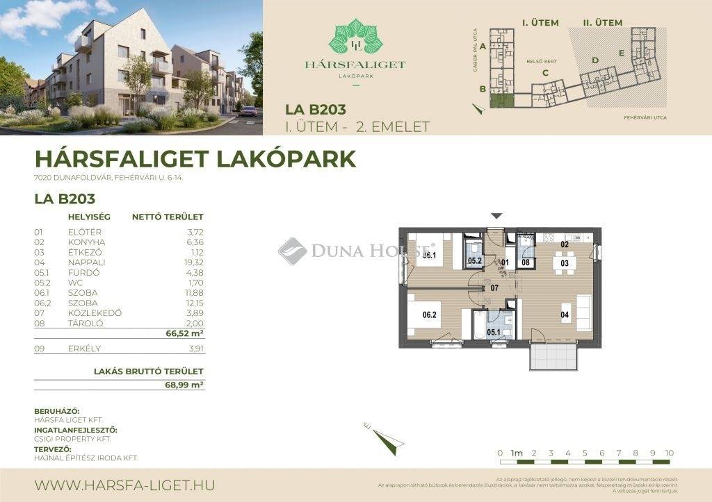 Az I. ütemben 46 és 87 m² közötti alapterületű, újépítésű lakások érhetők el, zöld környezetben, igény szerint garázzsal, parkolóval kiegészítve.