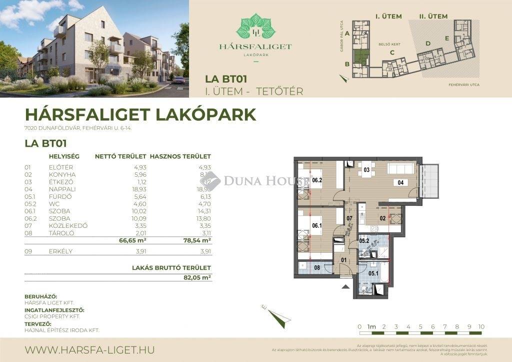 Az I. ütemben 46 és 87 m² közötti alapterületű, újépítésű lakások érhetők el, zöld környezetben, igény szerint garázzsal, parkolóval kiegészítve.