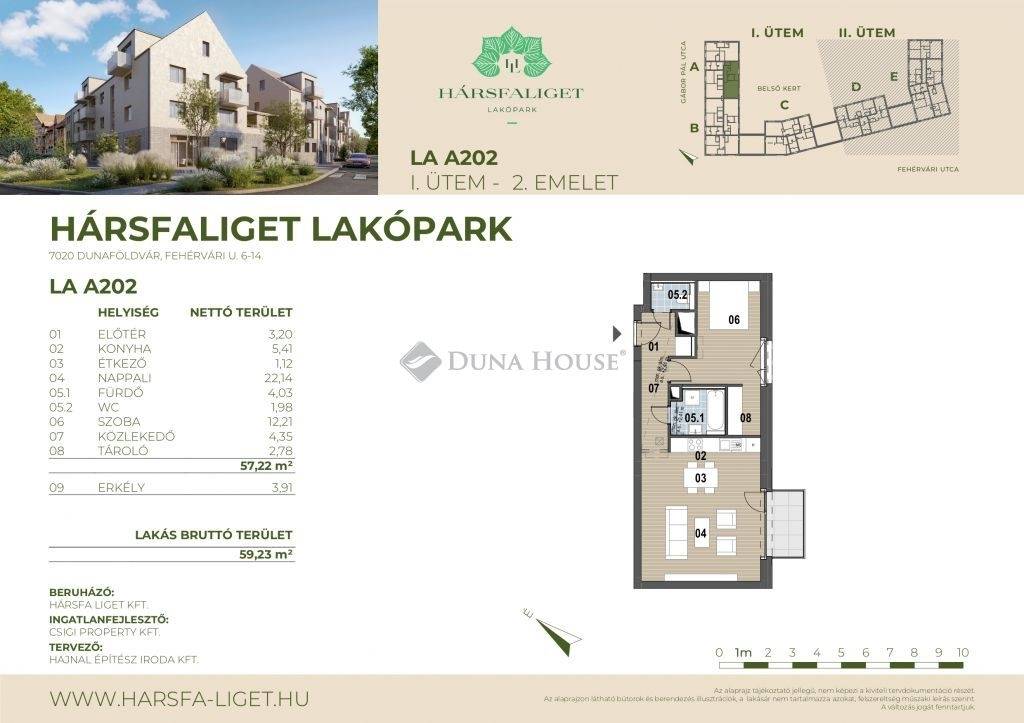Az I. ütemben 46 és 87 m² közötti alapterületű, újépítésű lakások érhetők el, zöld környezetben, igény szerint garázzsal, parkolóval kiegészítve.