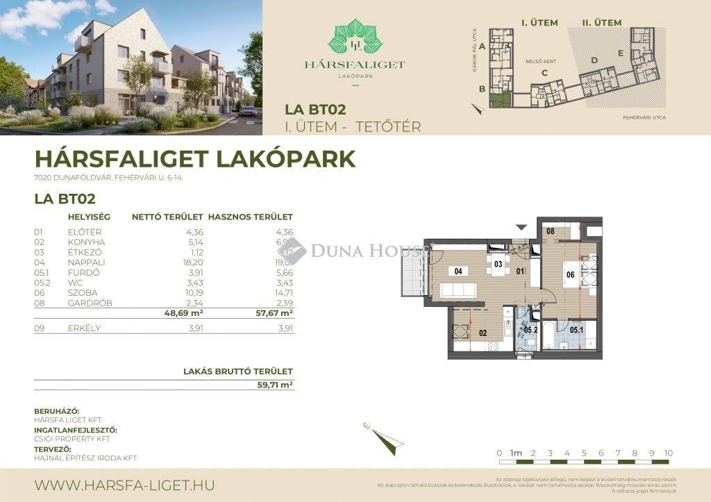 Az I. ütemben 46 és 87 m² közötti alapterületű, újépítésű lakások érhetők el, zöld környezetben, igény szerint garázzsal, parkolóval kiegészítve.