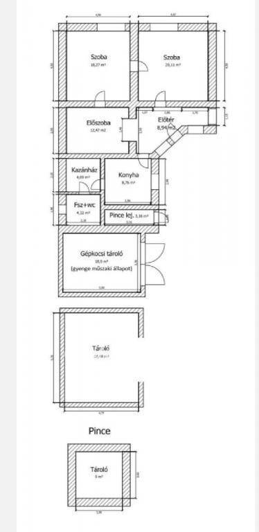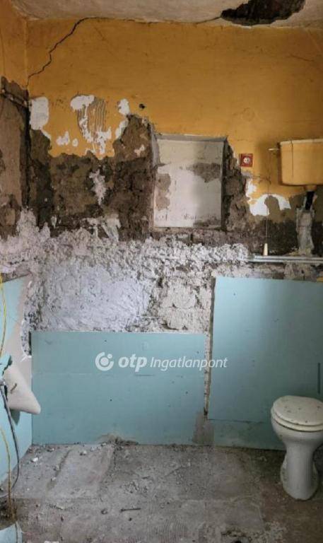 Használható fürdőszoba és WC nincs, a fürdőszoba hátsó fala hiányos, repedezett.
