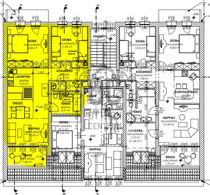 2 hálószoba, nappali, konyha, étkező, fürdő, 2 WC, előtér, közlekedő, terasz elrendezésű.