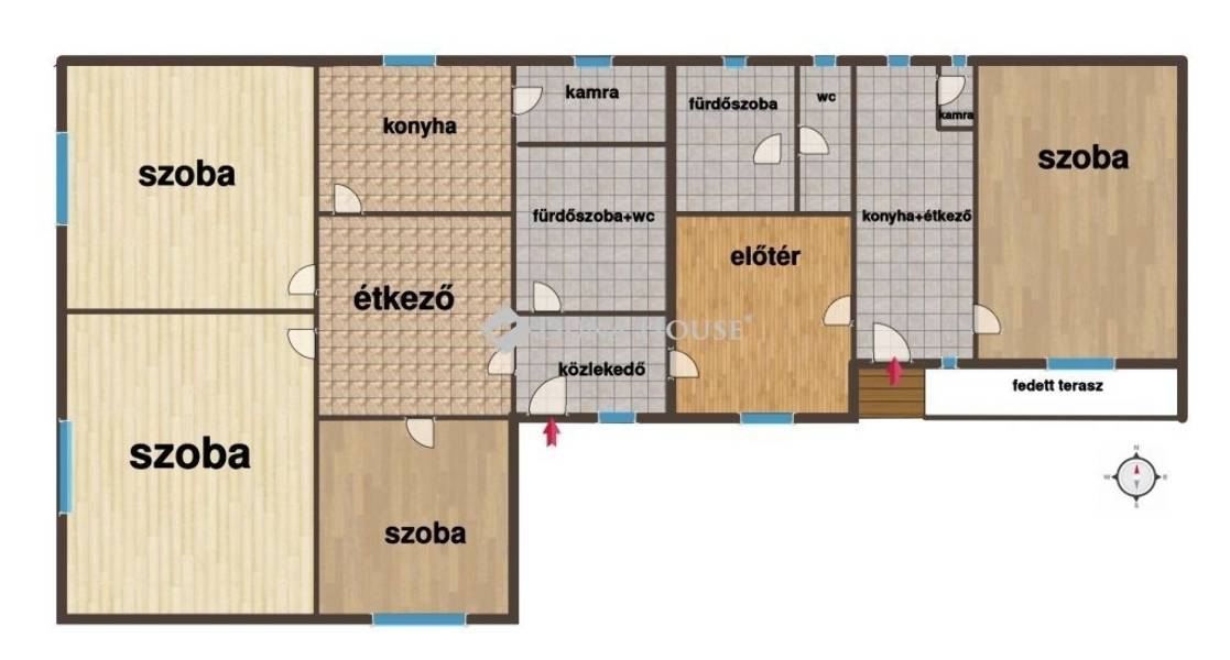 A régi lakrészben 3 kényelmes szoba, előtér, étkező kapott helyet, a bővítés során hátul 1 hálószoba, nappali és étkező került kialakításra. Mindkét lakrészben külön-külön konyha, fürdőszoba és wc áll rendelkezésre.