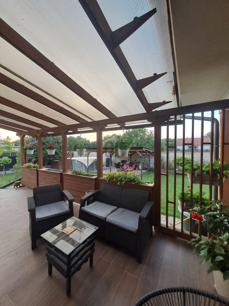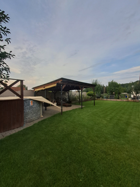 430 m² teljesen parkosított kert automata öntözőrendszerrel , örökzöldekkel, filagóriával, magas ágyással, ellenáramoltatós, hőgenerátoros 3,5 méter átmérőjű, medencével,