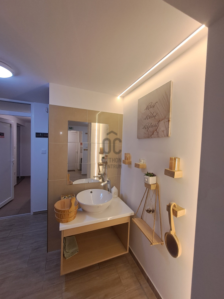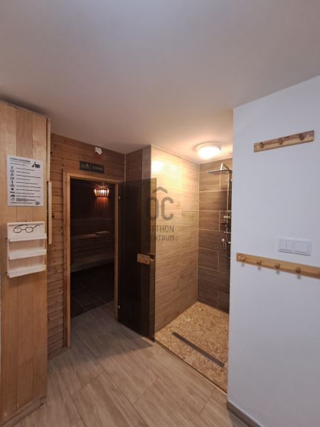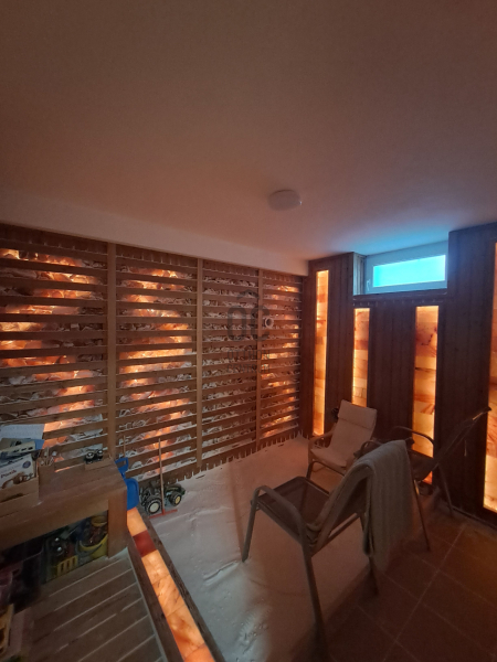 wellness részleg a pinceszinten:egy gerenátorral működtetett sóbefúvókkal felszerelt sóbarlang, egy 12 személyes újszerű állapotú finn szauna, két zuhanyzó, öltözők és két vendégwc, fűtött tepidárium ( kőpad) és pihenőrészleg.