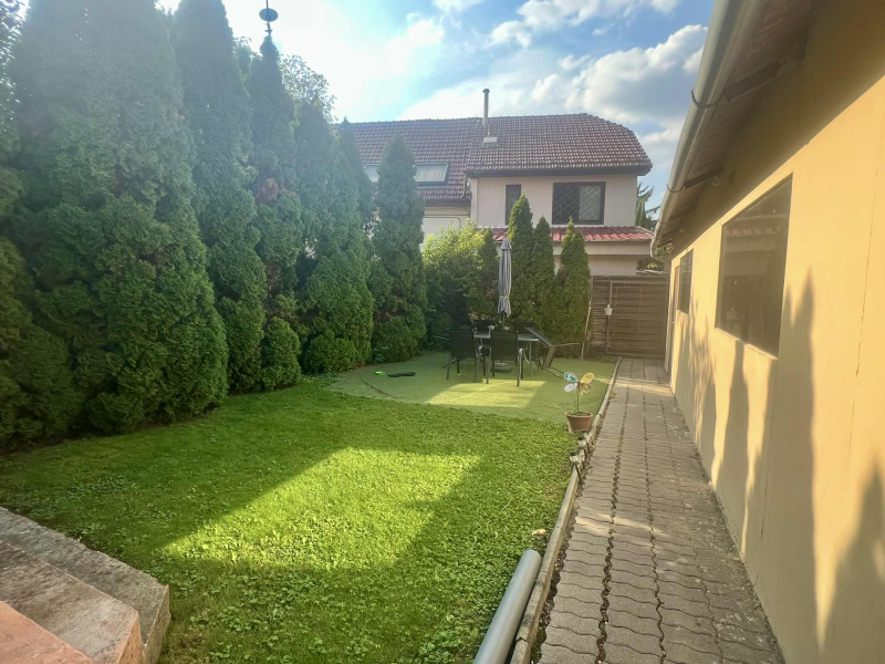 A kert rendezett, nagytujákkal, pihenésre és szabadtéri tevékenységre alkalmas. Két kocsis beállására alkalmas garázs, telken belül a bejáratnál ezenkívül akár három kocsi is befér és ingyenes utcai parkolási lehetőség is van.