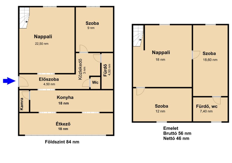 Földszint 84 nm, Emelet Bruttó 56 nm (Nettó 46 nm) összesen B-140 nm; N-130 nm.