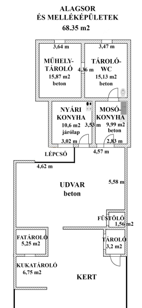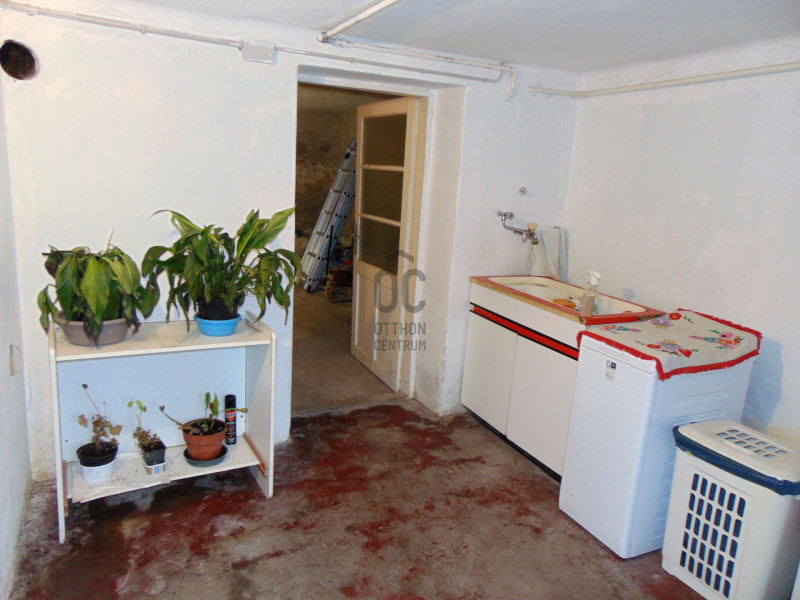 A szuterén-pince a lakószinttel megegyezően összközműves. A kertre néző oldalon egy nyári konyha és egy mosókonyha találhatóak, mindkettő önálló üveges ajtóval és külön ablakkal tekint az udvarra. Az utca felé két nagyméretű, vöröstégla falazatú alagsori-pince helyiség rejtőzik wc-vel, a ház vízóráival, műhelyasztallal és mélyhűtővel. Itt igény szerint akár családi szauna, játékterem vagy edzőterem is kialakíthatóak.