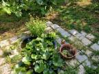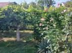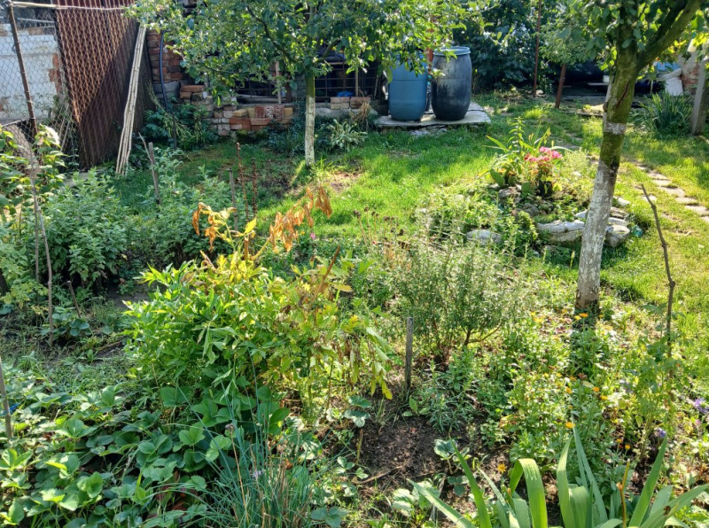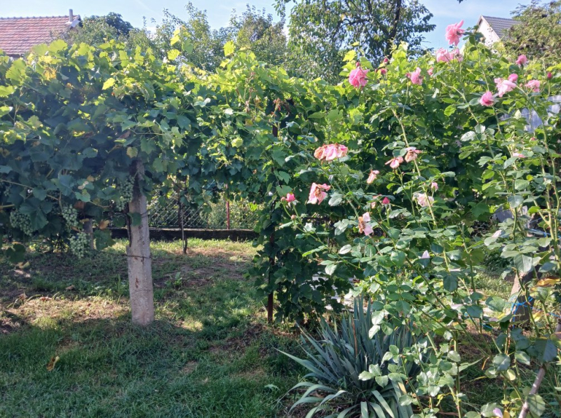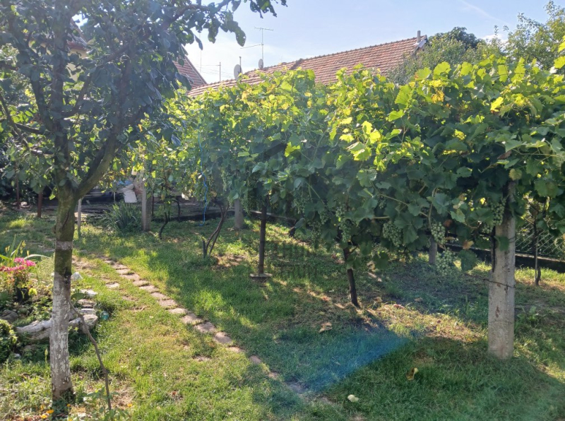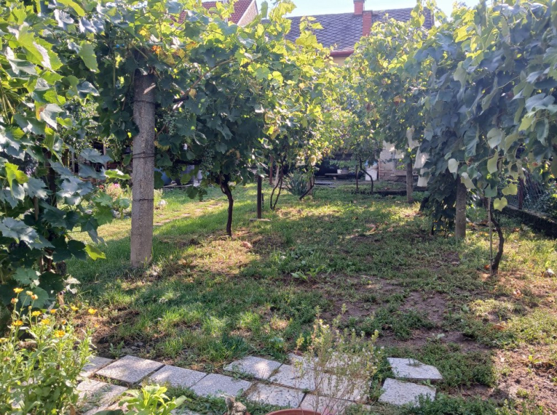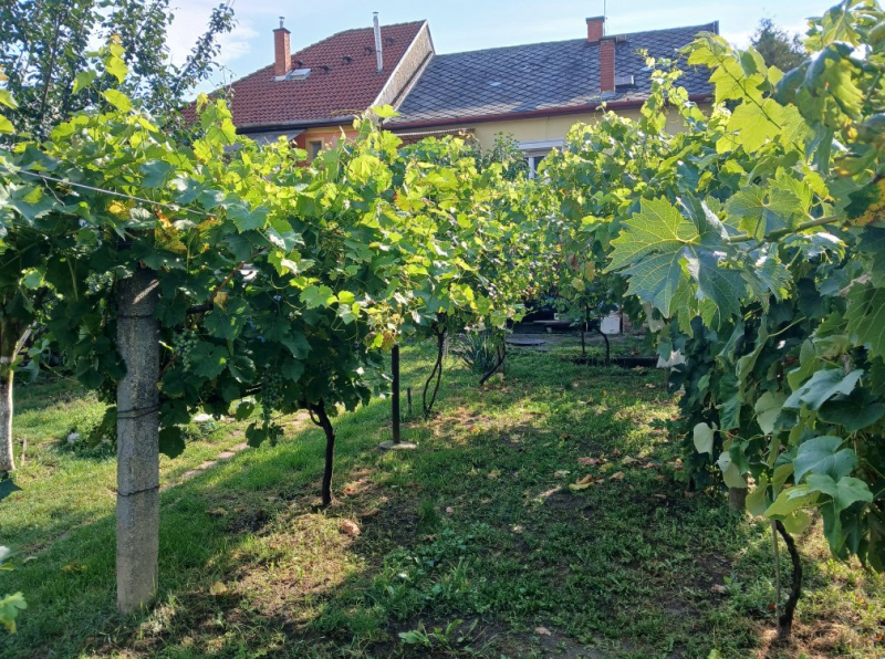 Az udvar kiemelkedő értéke az intimitása. Két oldalról kőfallal körbezárt, betonos első része, ahol a kert saját fúrt kútja is található, ideális a családi élet számára, akár gyermekmedence kihelyezésére, akár egy csendes reggeli kávézásra, napozásra, akár egy nagyobb létszámú családi összejövetel meghitt légkörének biztosítására. Ez a rész nemcsak a szomszédok felől, de a fatároló melléképület és a kis, téglaépítésű füstölő-kemence révén részben a kert irányából is el van zárva. A melléképületek, kerti tároló mellett elhaladva a gondosan körbekerített kertbe jutunk, amely méretéhez képest (a telek egésze 301 m2) kiemelkedő kihasználtságú. A tavirózsás kerti tó körül császárkörte, szilva és alma, rózsák és hatféle szőlő teremnek: a Moldova, muskotályos, szőlőskertek királynője, Teréz, kecskecsöcsű és olasz magnélküli nagyszemű fajták a csemegeszőlők egyedi változatosságát kínálják. A szőlő és a bor városa cím itt nemcsak közhely, hanem a kert és a városrész a közeli műemlék pincesorral és borkereskedéssel rá is szolgálnak erre.