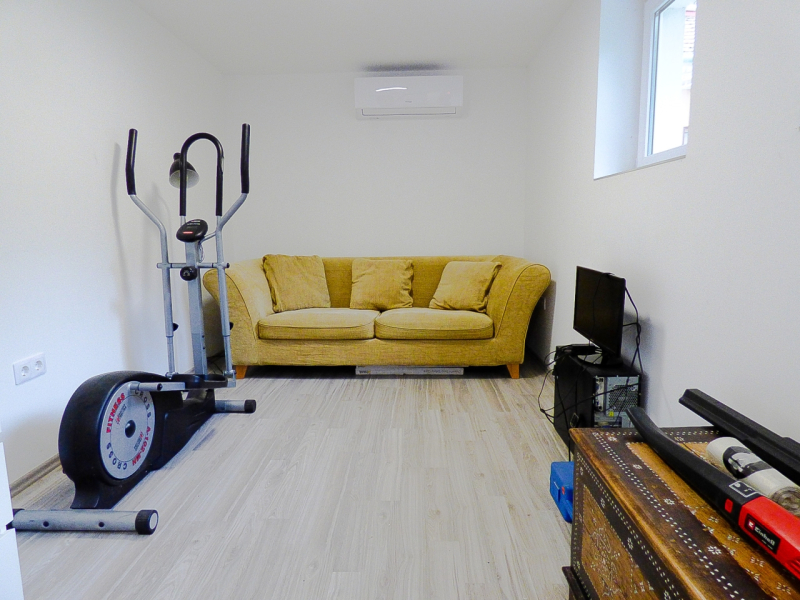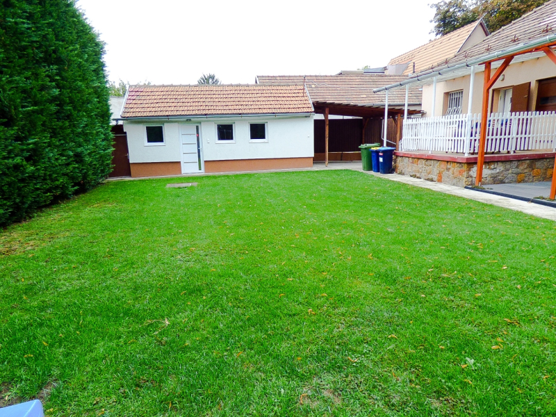 A kert hátsó részében egy 23 nm-es fűthető - hűthető (klímával, a fürdőben törölköző szárítóval) kis ház kapott helyet, amely 1 szobából, fürdőszobából és előtérből áll. Az előtér alkalmas teakonyha kialakítására. Egy idősebb szülő, nagy gyermeknek egy külön álló lakrésznek vagy home office jellegű irodának, kisebb vállalkozásnak kiváló lehetőség.