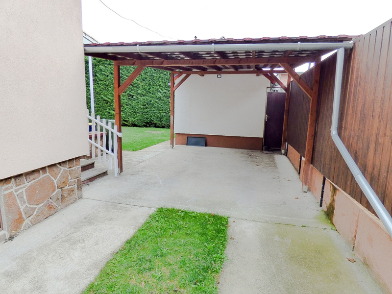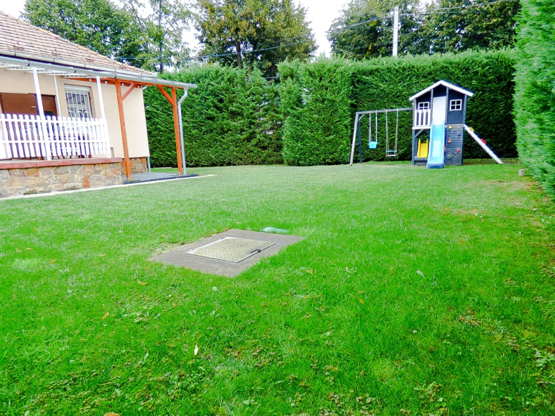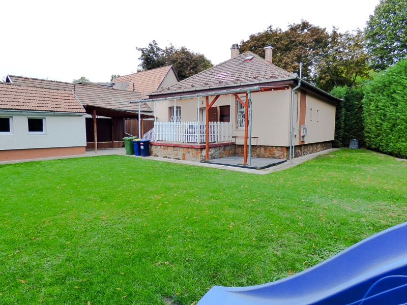 A kert rendezett, karbantartott, gyönyörű 5 m magas tuja sorral körbekerített, ezzel is biztosítva az intim szférát. A hátsó rész alkalmas kikapcsolódásra, pihenésre, az oldalsó részen automata kapun keresztül megközelíthető fedett gépkocsi beálló kapott helyet, továbbá fúrt kút, öntöző rendszer, gyermekeknek játszótér áll az új tulajdonosok rendelkezésére.