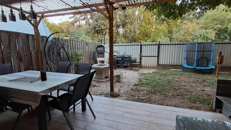 Az otthon hangulatát és komfortját a korszerű fűtési rendszer biztosítja: gázkazán, radiátorok, padlófűtés és egy samott téglás, fatüzeléses kandalló, amely meghitt légkört teremt a hidegebb hónapokban. A nyári hőségben három split klíma gondoskodik a kellemes hőmérsékletről. A házhoz tartozó, közel 100 m²-es kert teljesen elszeparált, így tökéletes helyszínt kínál pihenésre, játékra vagy akár családi, baráti összejövetelekhez. A fedett terasz ideális reggeli kávéhoz vagy közös étkezésekhez. A praktikus melléképületek – a közel 25 m²-es különálló garázs, a fedett kocsibeálló és a fáskamra – tovább növelik a kényelmet és a hasznos tárolási lehetőségeket.