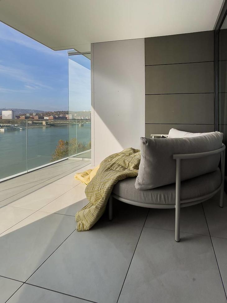 A most eladásra kínált, 51 m²-es, 5. emeleti, vadonatúj, bútorozott lakás páratlan, közvetlen kilátást nyújt a Dunára és a Gellérthegyre. A 21 m²-es üvegkorlátos teraszról nyíló látvány minden napot felejthetetlenné tesz.
