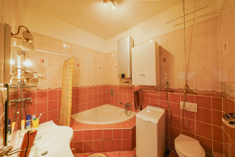 A tágas nappali nagy belmagassága és világos, napfényes ablakai azt az érzést keltik, hogy az otthonod valóban egy oázis a város zajától. A fürdőszoba jól megtervezett és kifejezetten tágas, így a reggeli rutin során sem kell kompromisszumot kötnöd a kényelem terén.