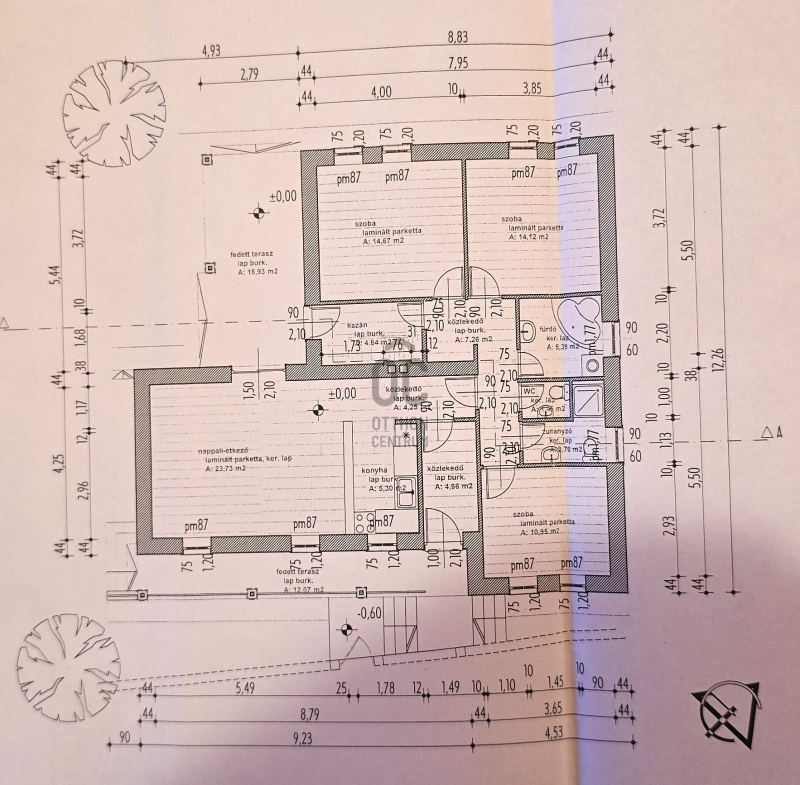 -főépület: 100 nm+ 17 nm terasz; melléképület: 45 nm + 11 nm terasz