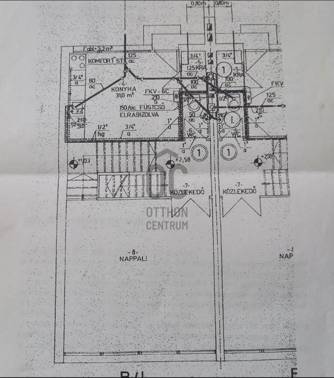 Első szint: külön WC, tágas amerikai konyhás nappali közvetlen teraszkapcsolattal és kerttel, ahol egy fészer is helyet kapott,