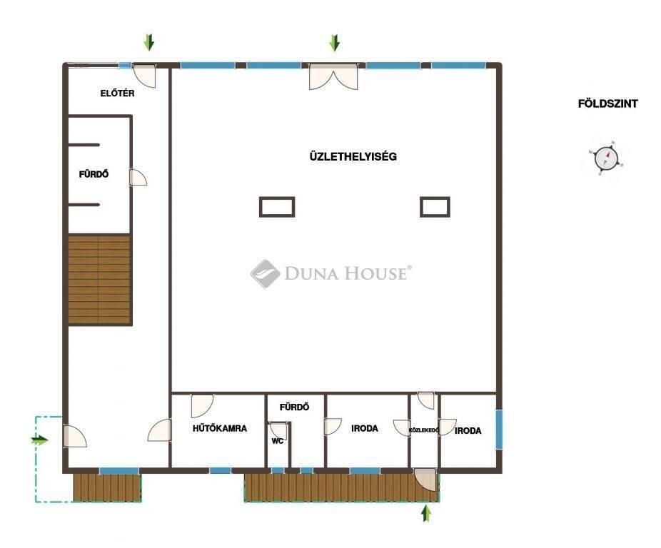 A magasföldszinten egy utcára nyíló, 174 nm-es, óriási üzlethelyiség és kiszolgáló helyiségek: iroda, raktár, öltöző, fürdő, hűtőkamra.