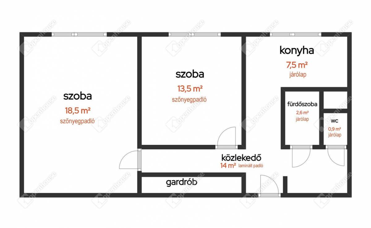 - a szobákban padlószőnyeg a folyosón laminált padló, a többi helyiségben járólap van