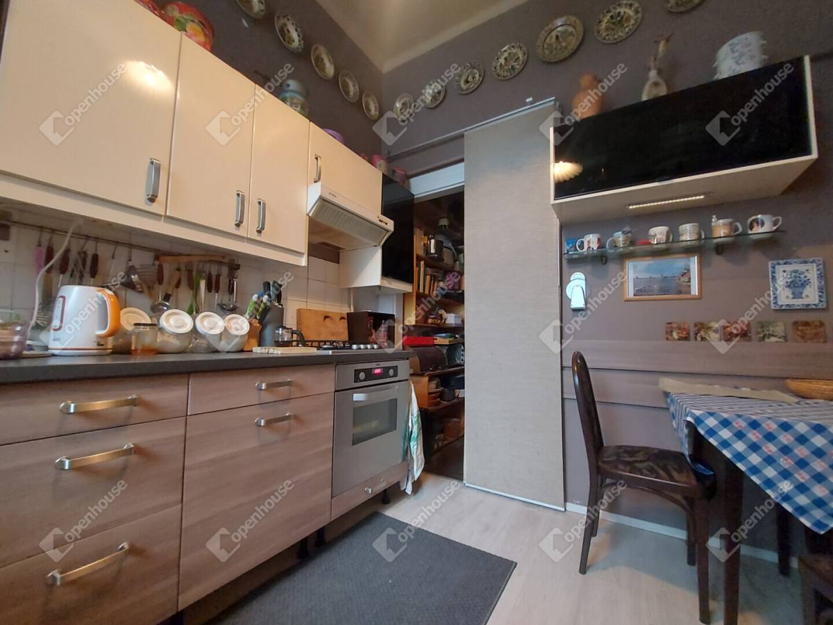 A lakás bensőséges atmoszféráját a 3 métert meghaladó belmagasság, a klasszikus polgári arányok és a nagyvonalúan kialakított terek adják. Az elrendezés jelenleg egy közel 30 m²-es, reprezentatív nappaliból, egy tágas hálószobából, berendezett konyhából, kamrából, fürdőszobából és egy praktikus alkóvból áll. A terek könnyedén alakíthatók: igény szerint akár három szobássá formálható, így család, fiatal pár vagy akár elegáns iroda számára is kiváló választás.